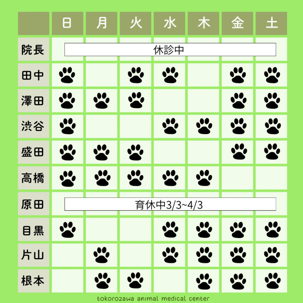 獣医師の出勤状況につきましては、急遽不在になる場合もございます。