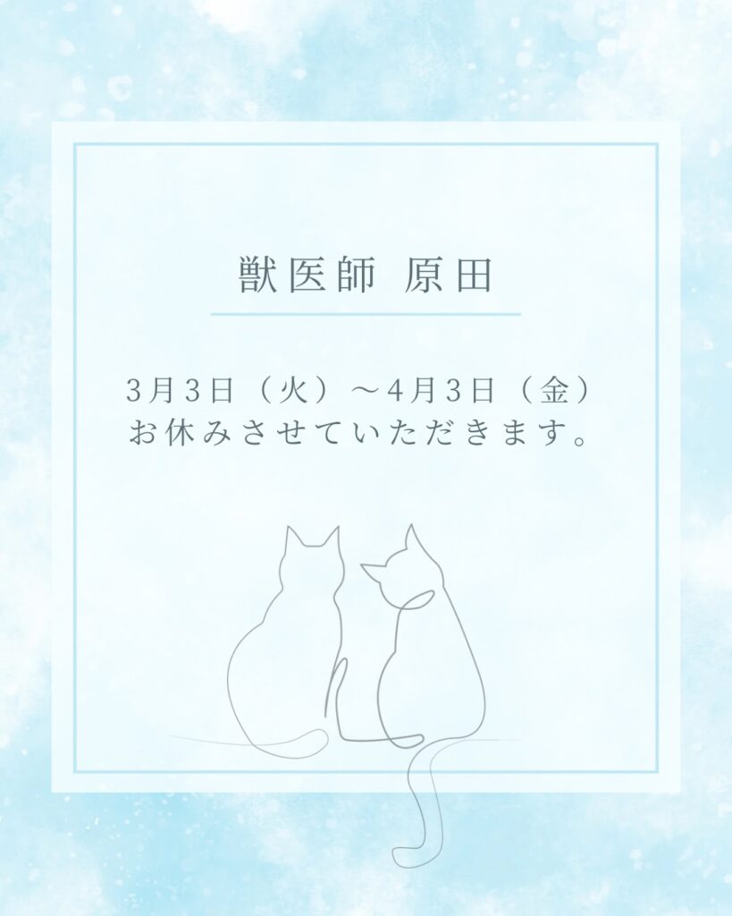 3/3~4/3の期間、育児休業のためお休みをいただきます。
