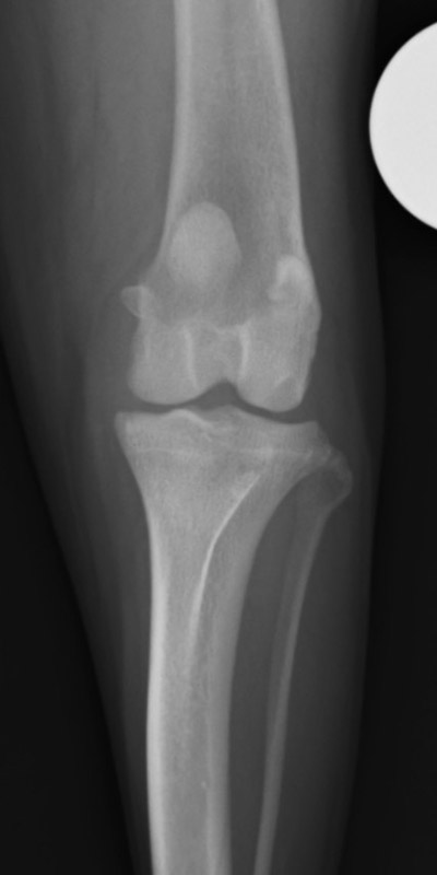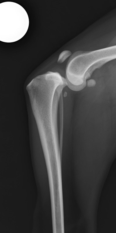 次にレントゲン検査にて骨の形や位置、および前十字靭帯を損傷した時に認められるファットパットサイン(関節液が貯留して関節包が拡張し、脂肪体が圧迫され変位した像)を確認します。